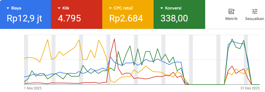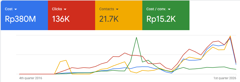 Dapatkan strategi dan hasil Google Ads dari praktisi 7+ tahun pengalaman, fokus pada hasil bukan sekadar klik. Mulai dari analisa, setup, monitoring hingga reporting. Semua terima beres.