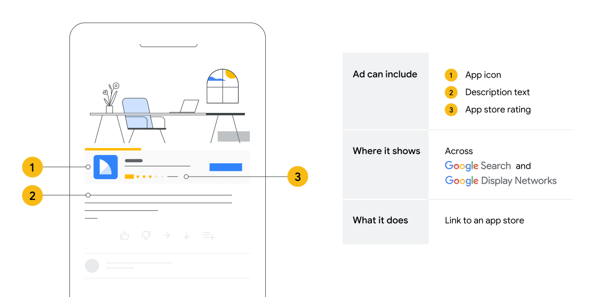 Iklan aplikasi untuk tindakan install atau event di dalam aplikasi seperti subscribe atau item puchase. Bisa untuk Android dan iOS.